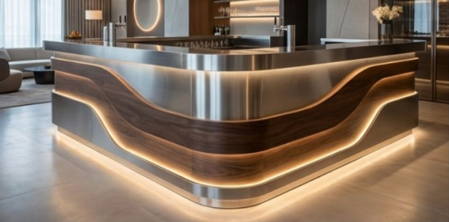 - Barras de bar iluminadas y mobiliario de recepción a medida.